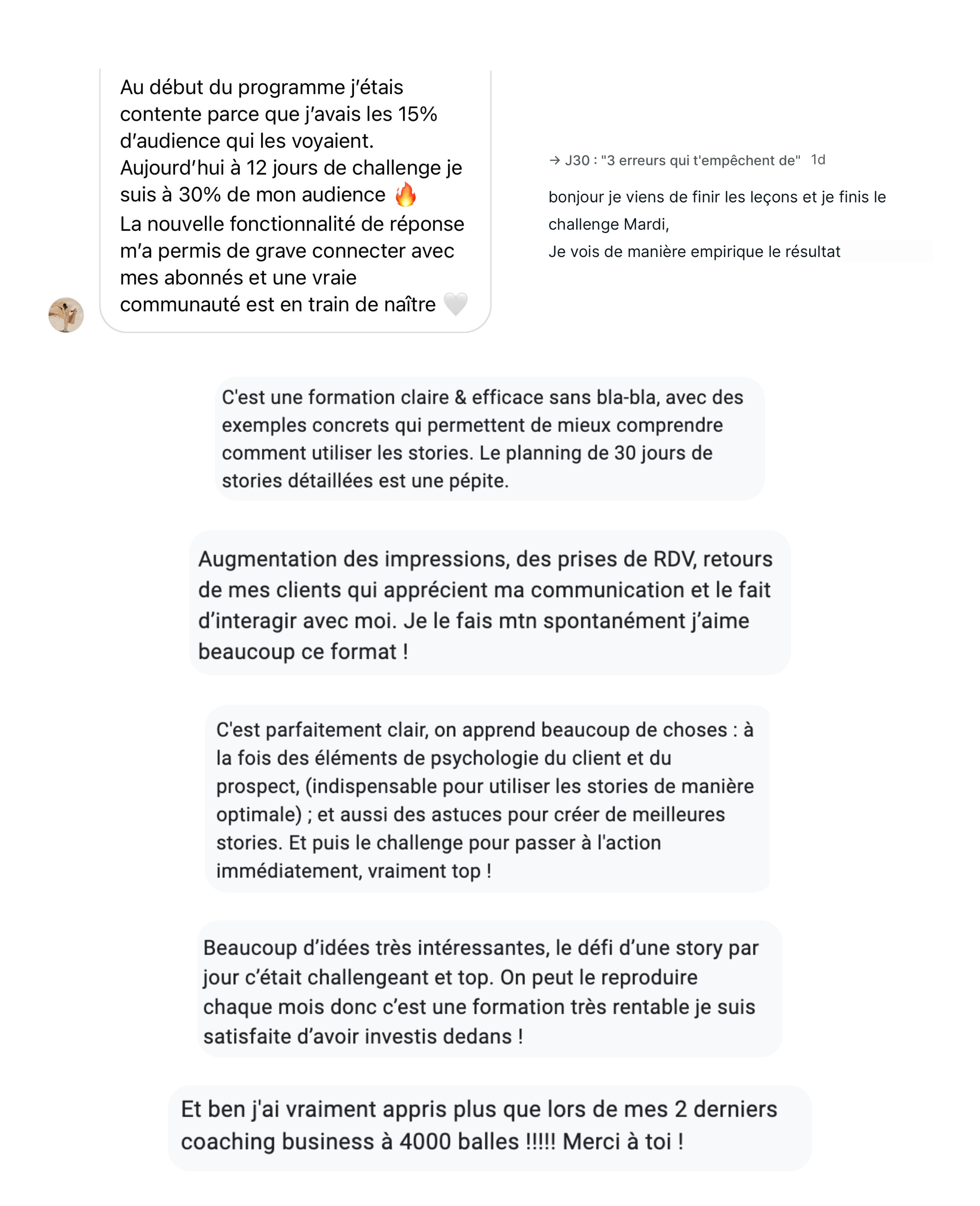 J'ai vraiment pris confiance en moi et j'ai upgradé x1000 ma stratégie Instagram (ligne édito, clientèle idéale, charte graphique...). Mon compte me ressemble plus et ça attire les bonnes personnes, donc dans le mille ! En quelques semaines seulement, mes demandes par messages privés ont augmenté !